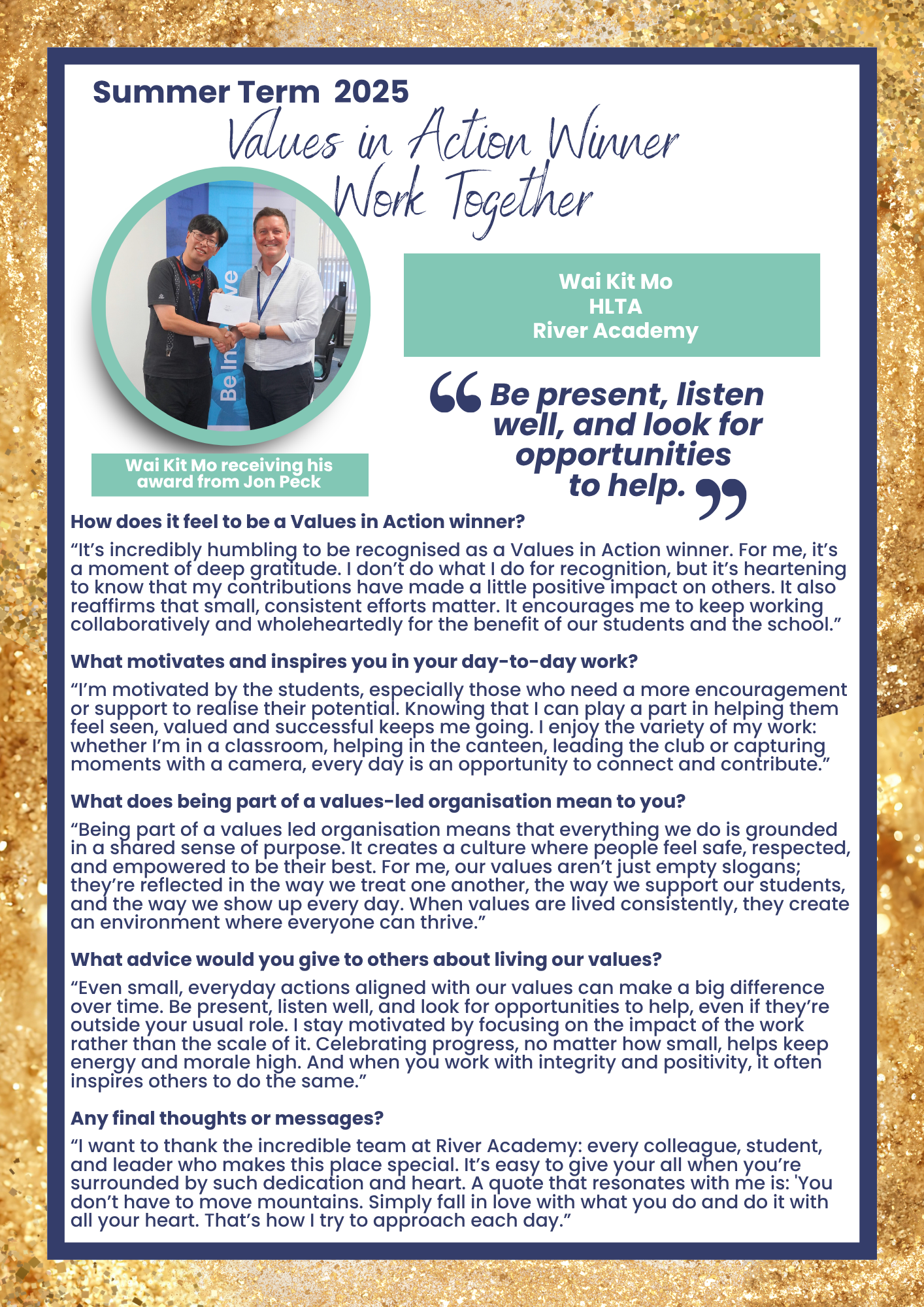 We’re delighted to announce that Wai Kit Mo, HLTA at River Academy, has been recognised by Maiden Erlegh Trust as our Values in Action winner for Work Together.